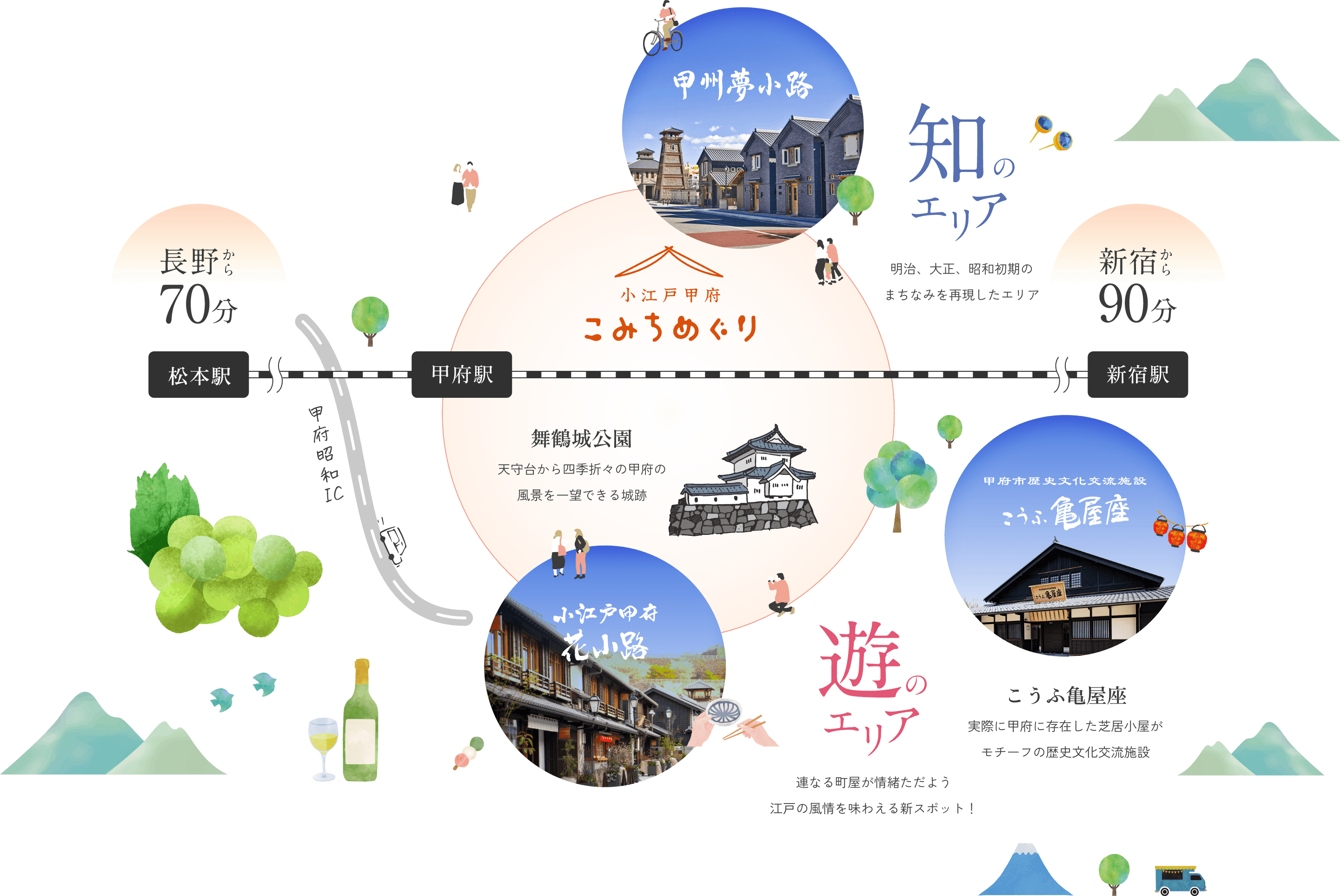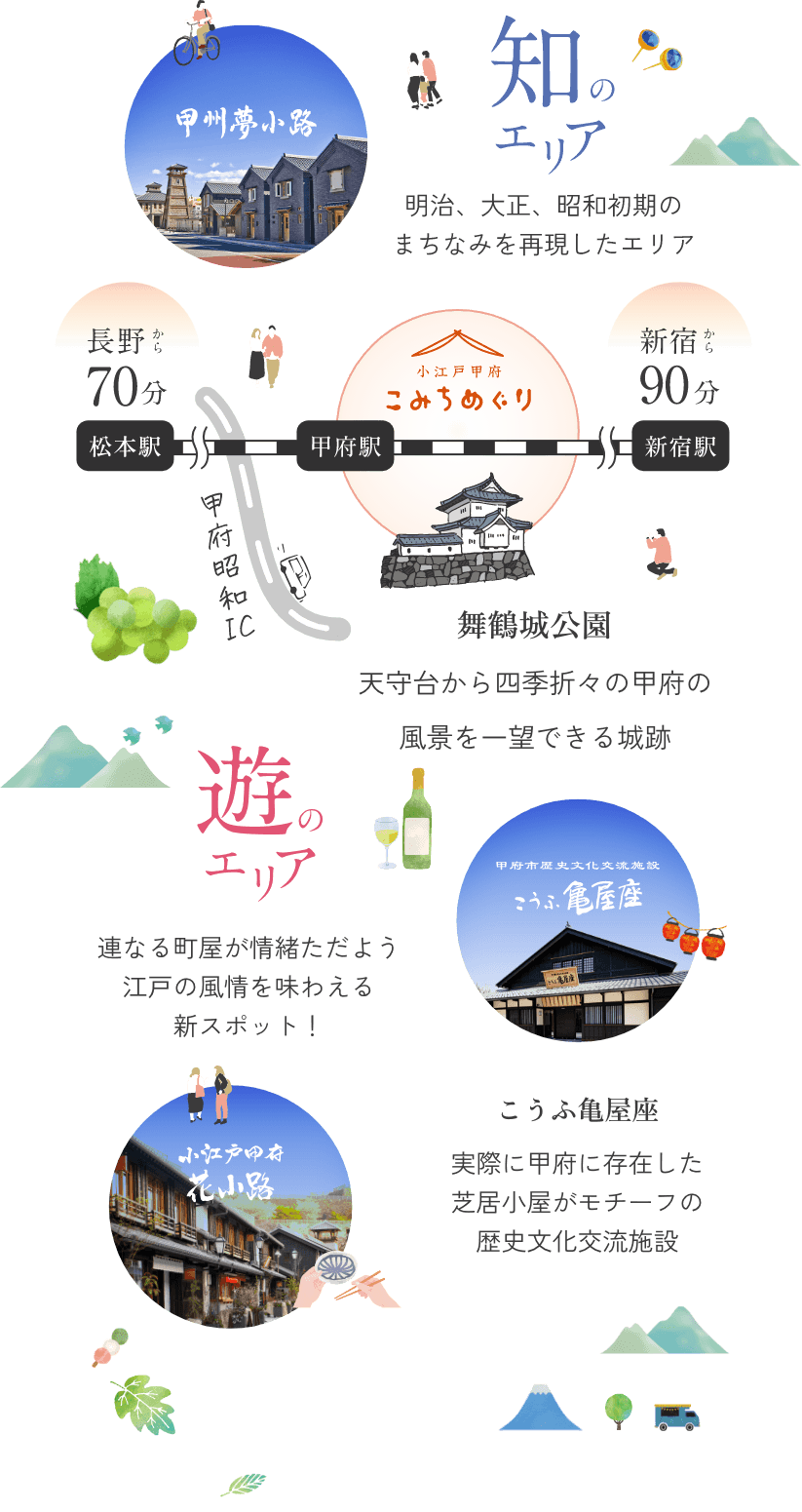 甲府には駅を拠点として歩ける場所に、小江戸情緒や歴史を感じる、小路めぐりにおすすめの場所がたくさんあります。主要都市からも2時間圏内でアクセスできるため、週末のちょっとしたトリップにもおすすめです。