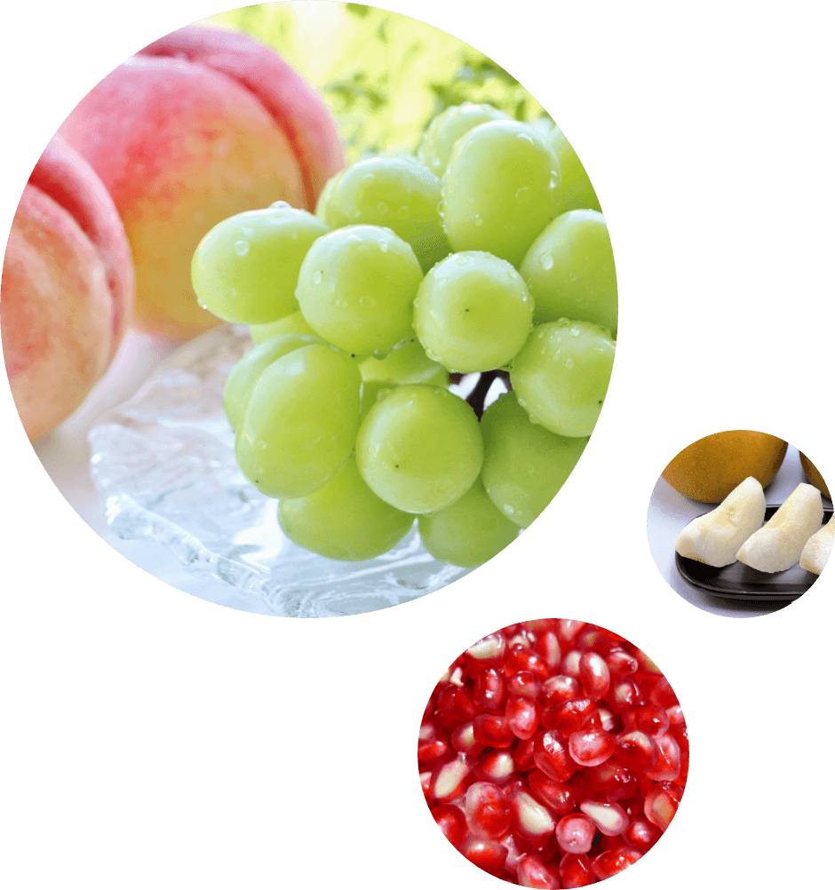 江戸時代の甲府には、とてもおいしい食べ物がたくさんありました。例えば、うなぎやそば、お寿司などがあり、その味は江戸にも負けないくらいおいしいといわれていました。今でも作られているアワビの煮貝や甲州小梅、月の雫というお菓子も、この頃からあったことがわかっています。また、8種類の果物が作られていて、ぶどう、なし、もも、かき、くり、りんご、ざくろ、くるみ(またはぎんなん)をまとめて「甲州八珍果(こうしゅうはっちんか)」と呼んでいました。