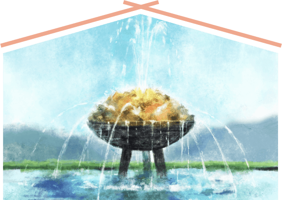 直径15mの池に設置された噴水塔は、水晶を模した無数の光学ガラスが積み重なっています。夜になるとライトアップされ駅前の夜空を彩りました。