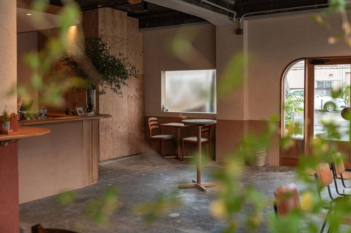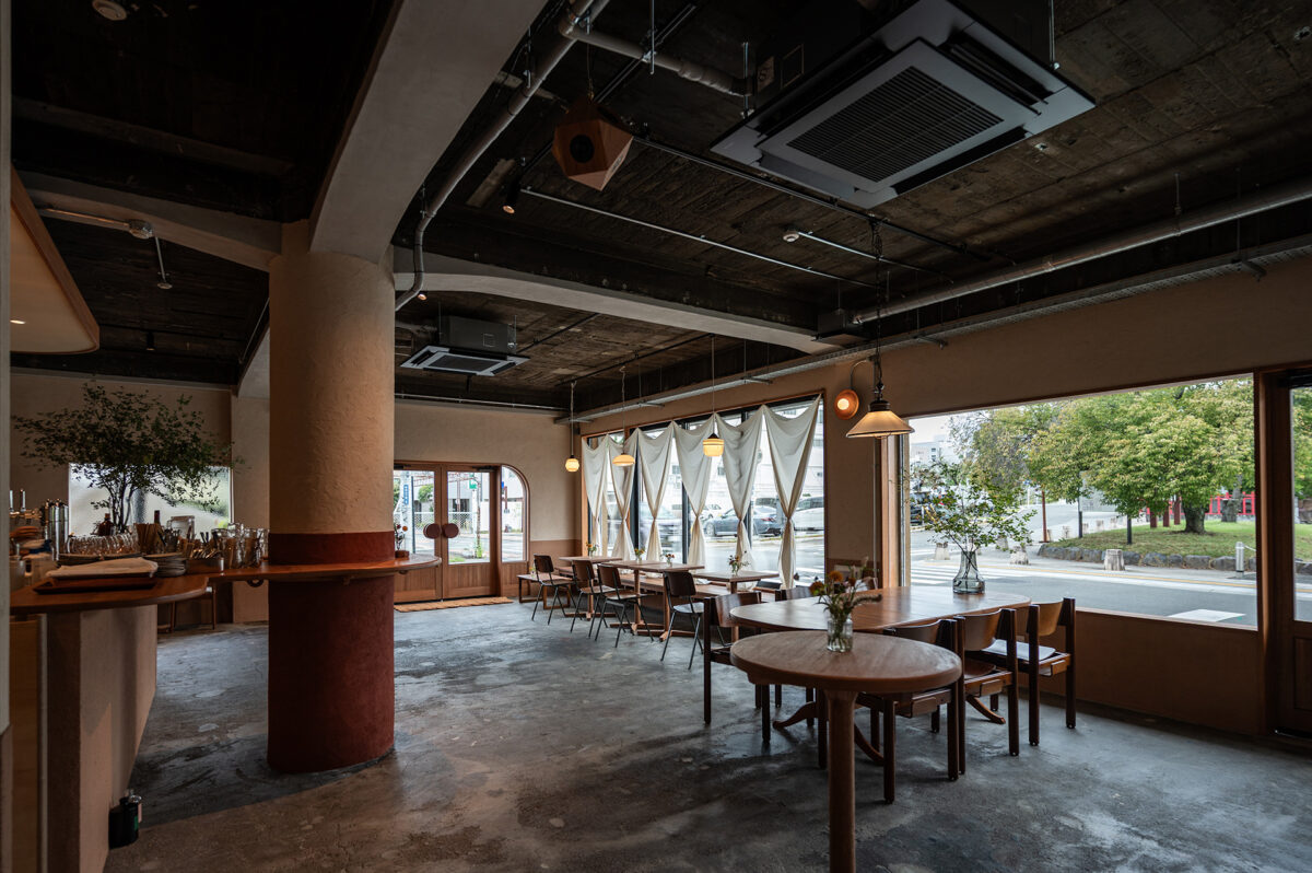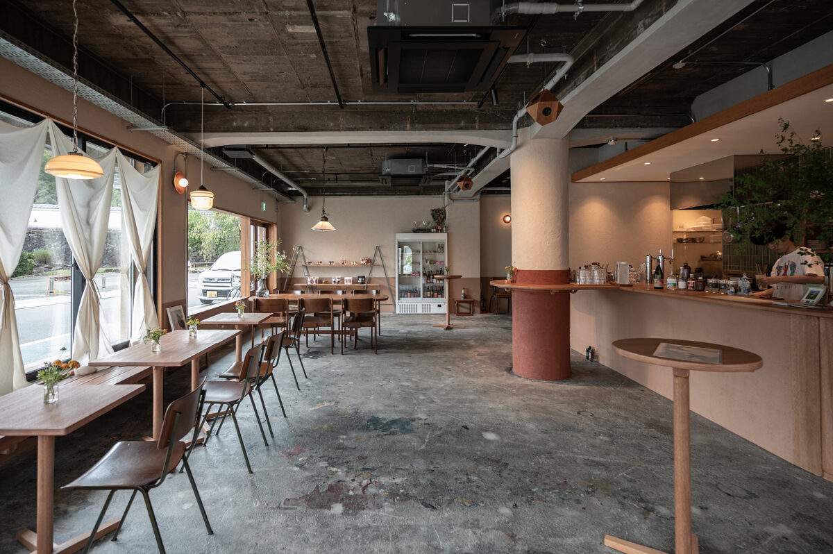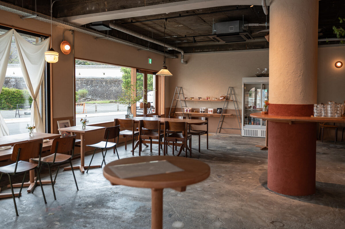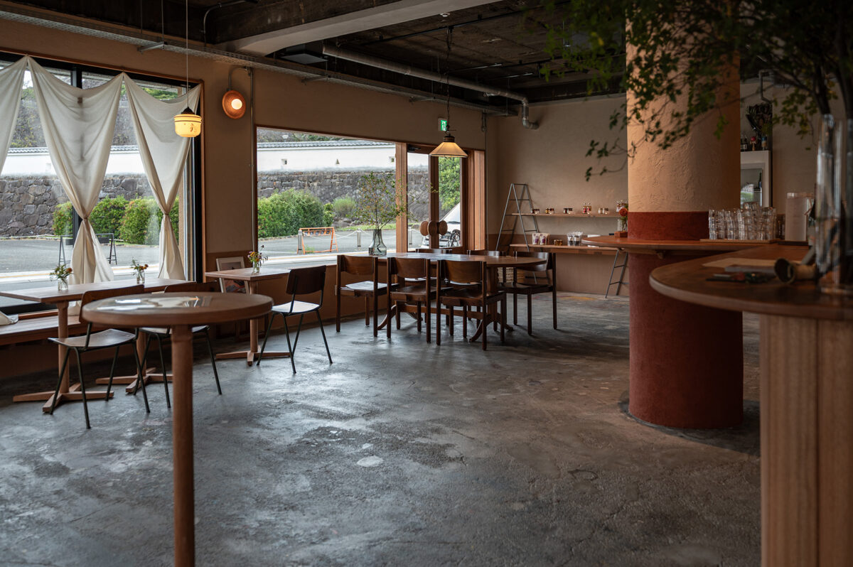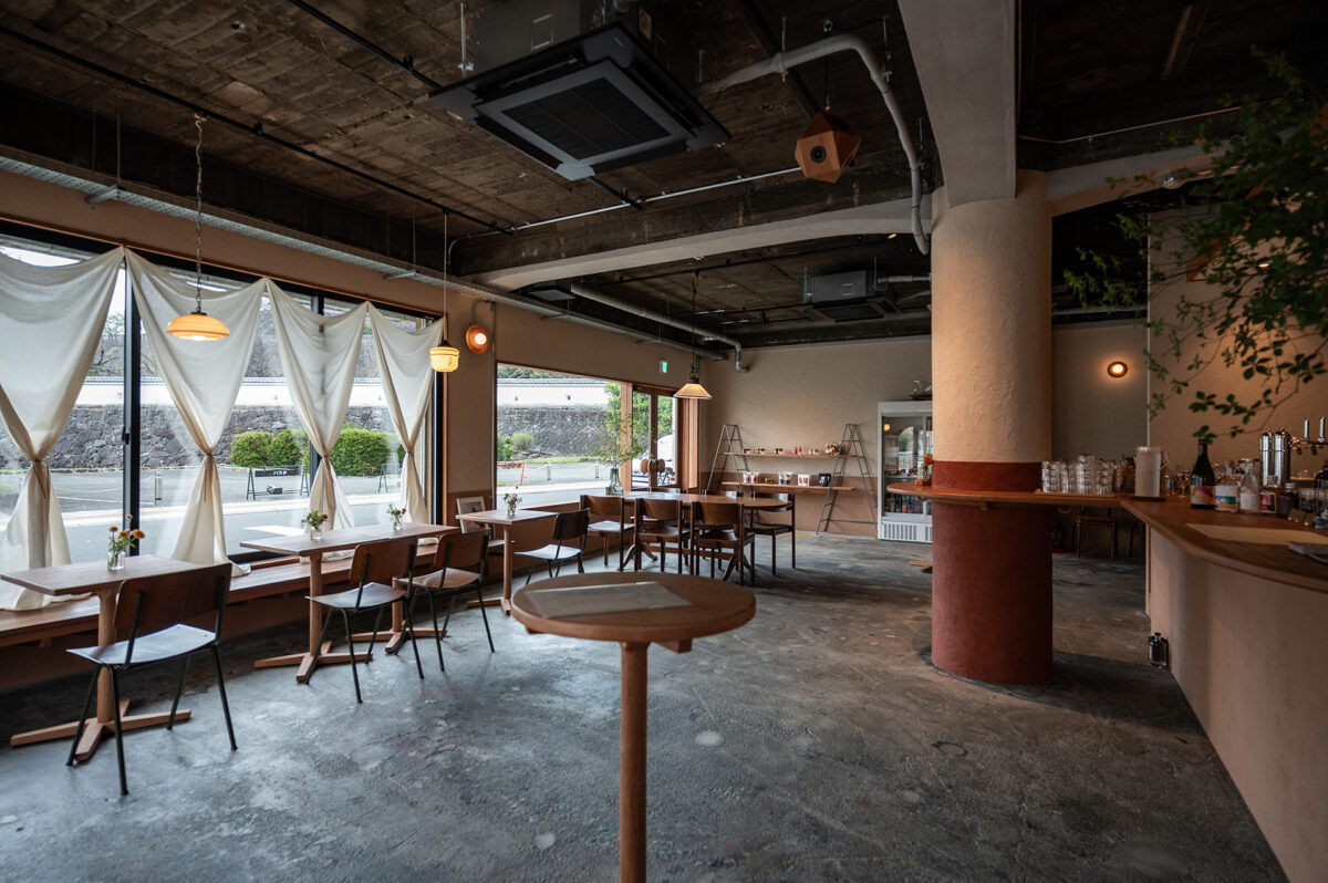 1階のカフェは、静かで洗練された時間が流れる、大人のための隠れ家のような雰囲気です。無機質なコンクリートと温かみのある木製家具が調和した空間に、自然光が優しく差し込みます。窓の外に広がる緑と石垣を眺めながら、淹れたてのハーブティーを片手にゆったりと過ごせます。