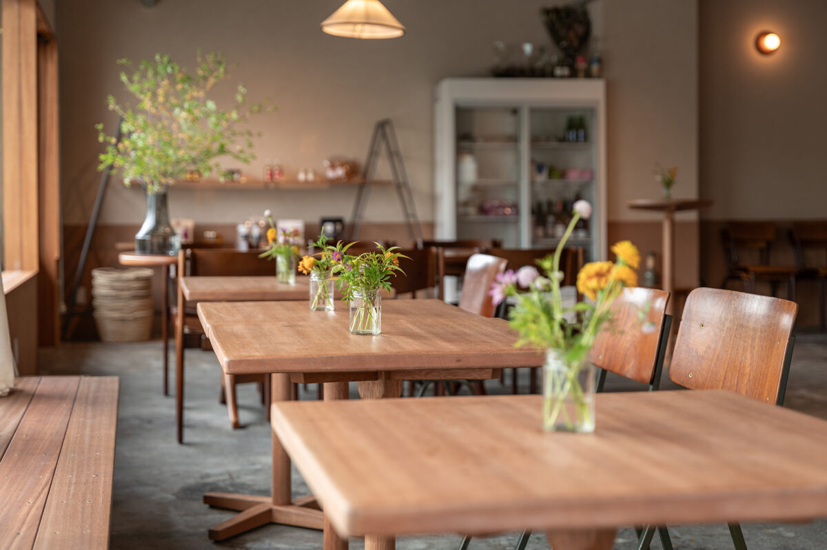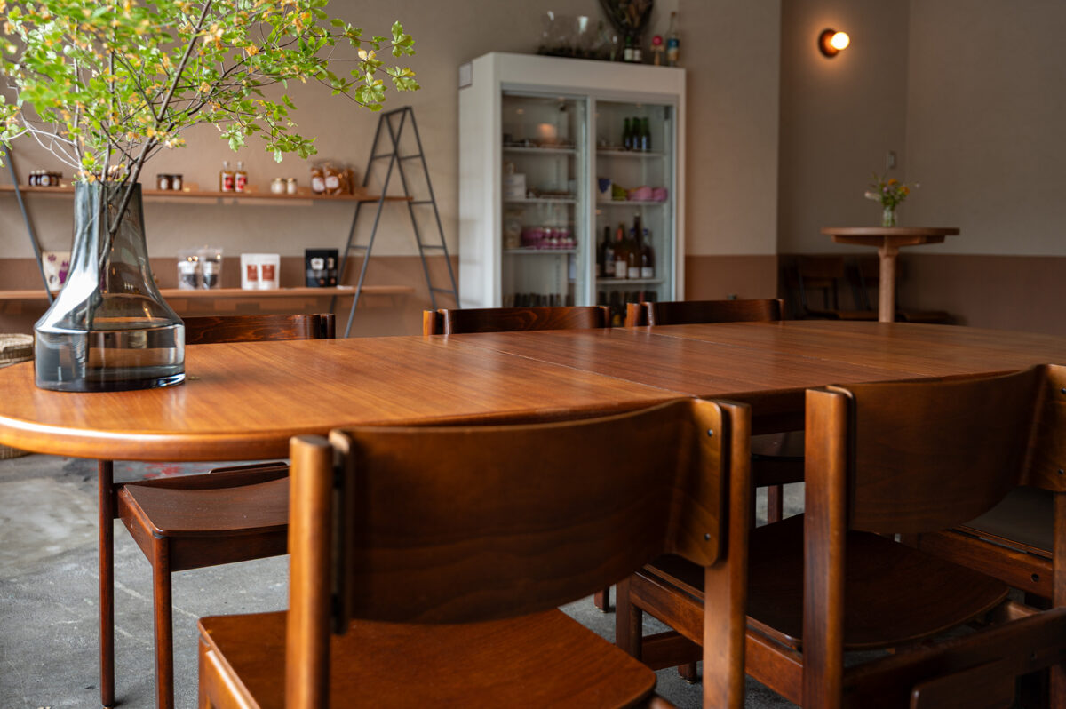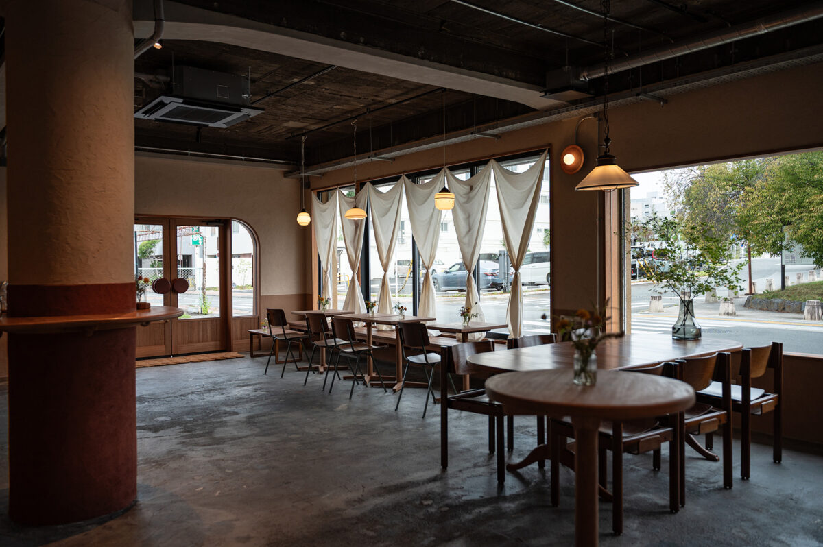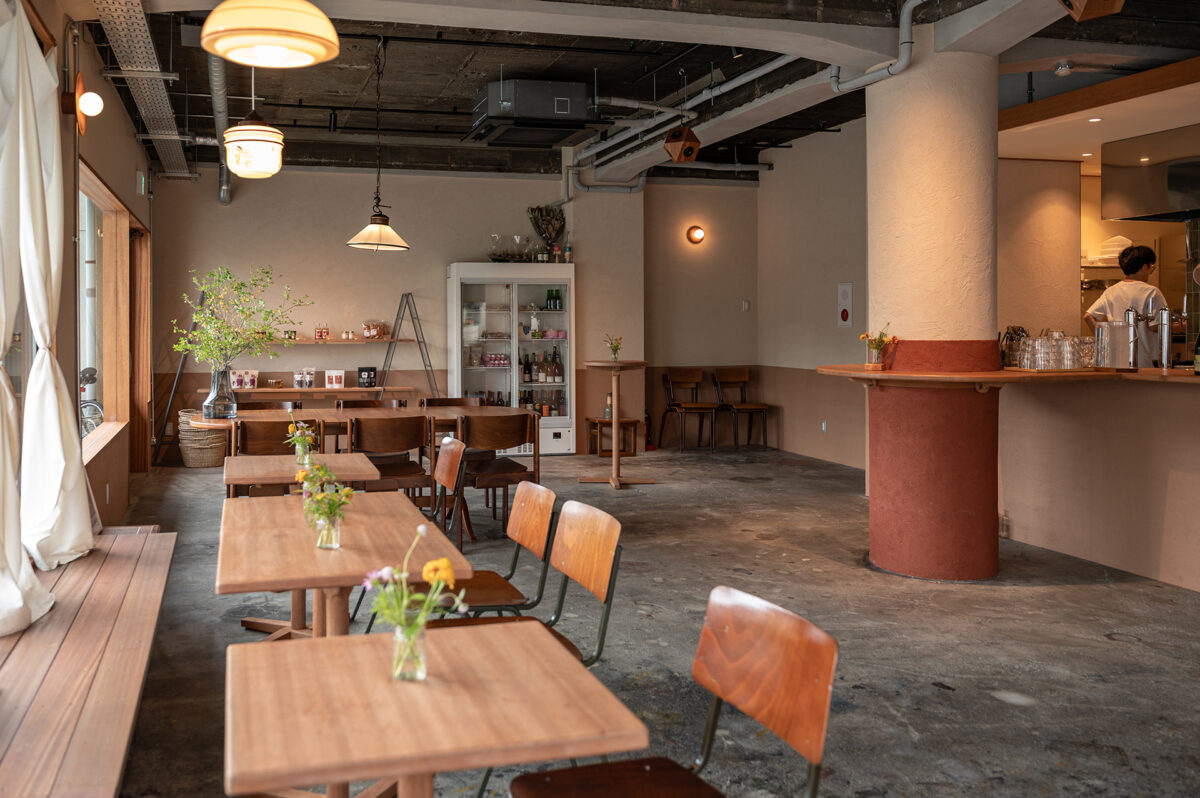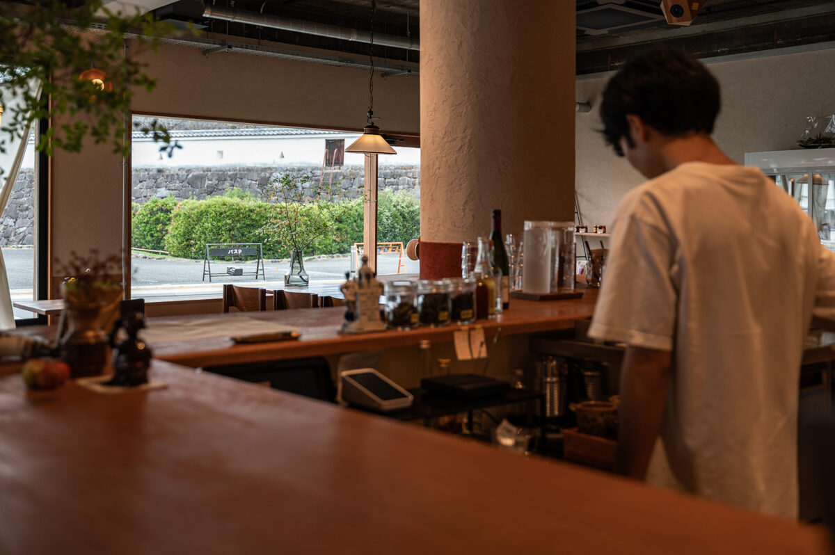 1階のカフェは、静かで洗練された時間が流れる、大人のための隠れ家のような雰囲気です。無機質なコンクリートと温かみのある木製家具が調和した空間に、自然光が優しく差し込みます。窓の外に広がる緑と石垣を眺めながら、淹れたてのハーブティーを片手にゆったりと過ごせます。
