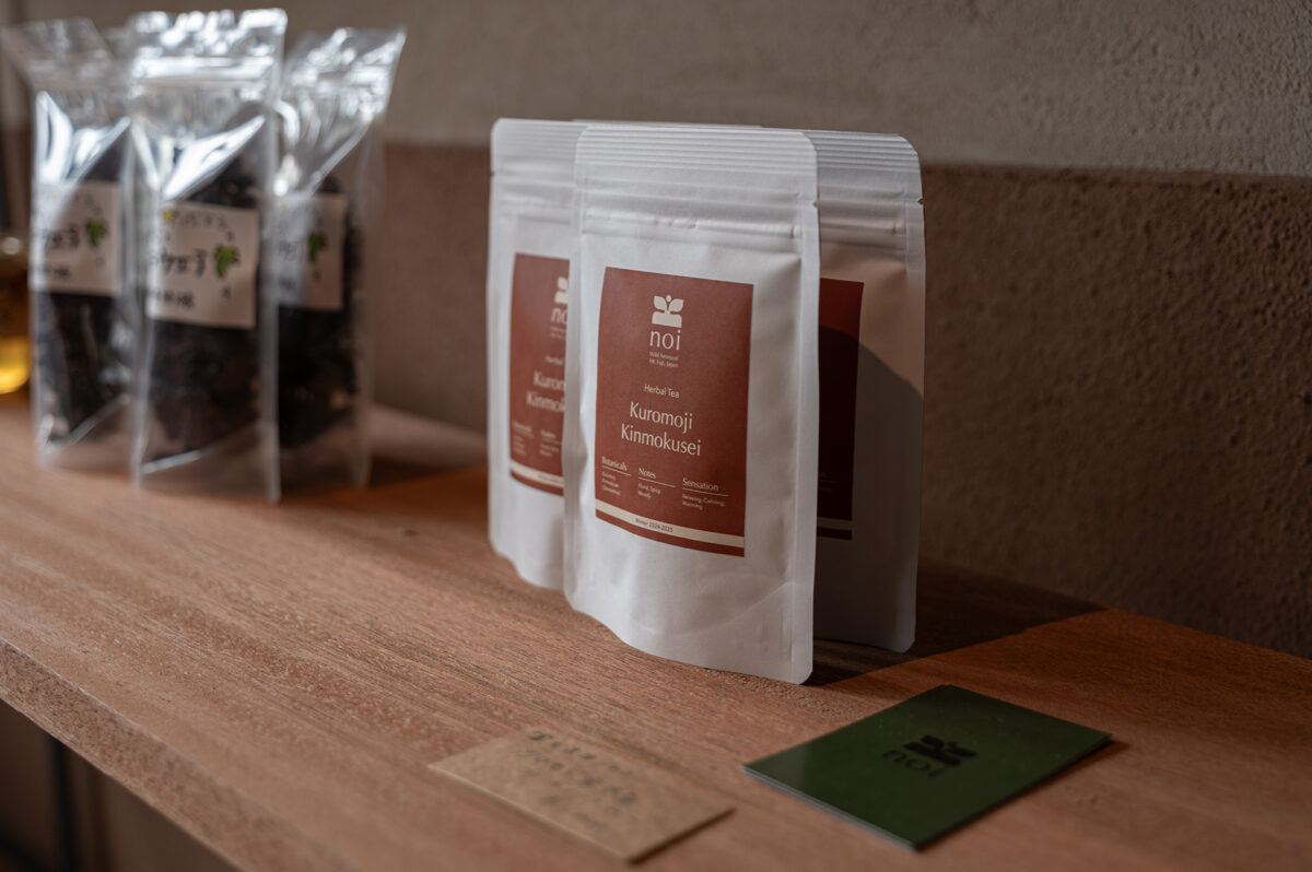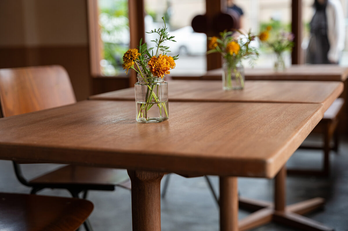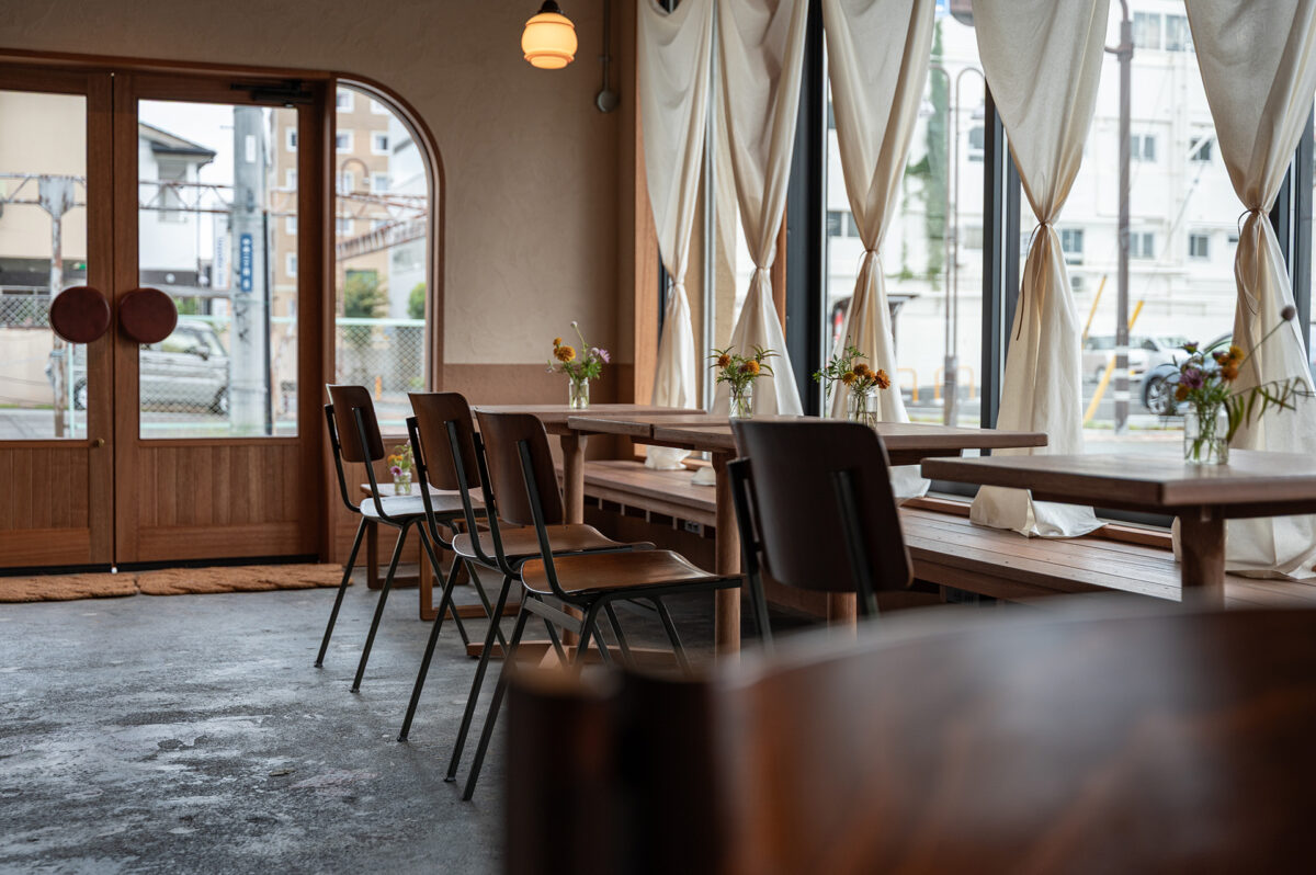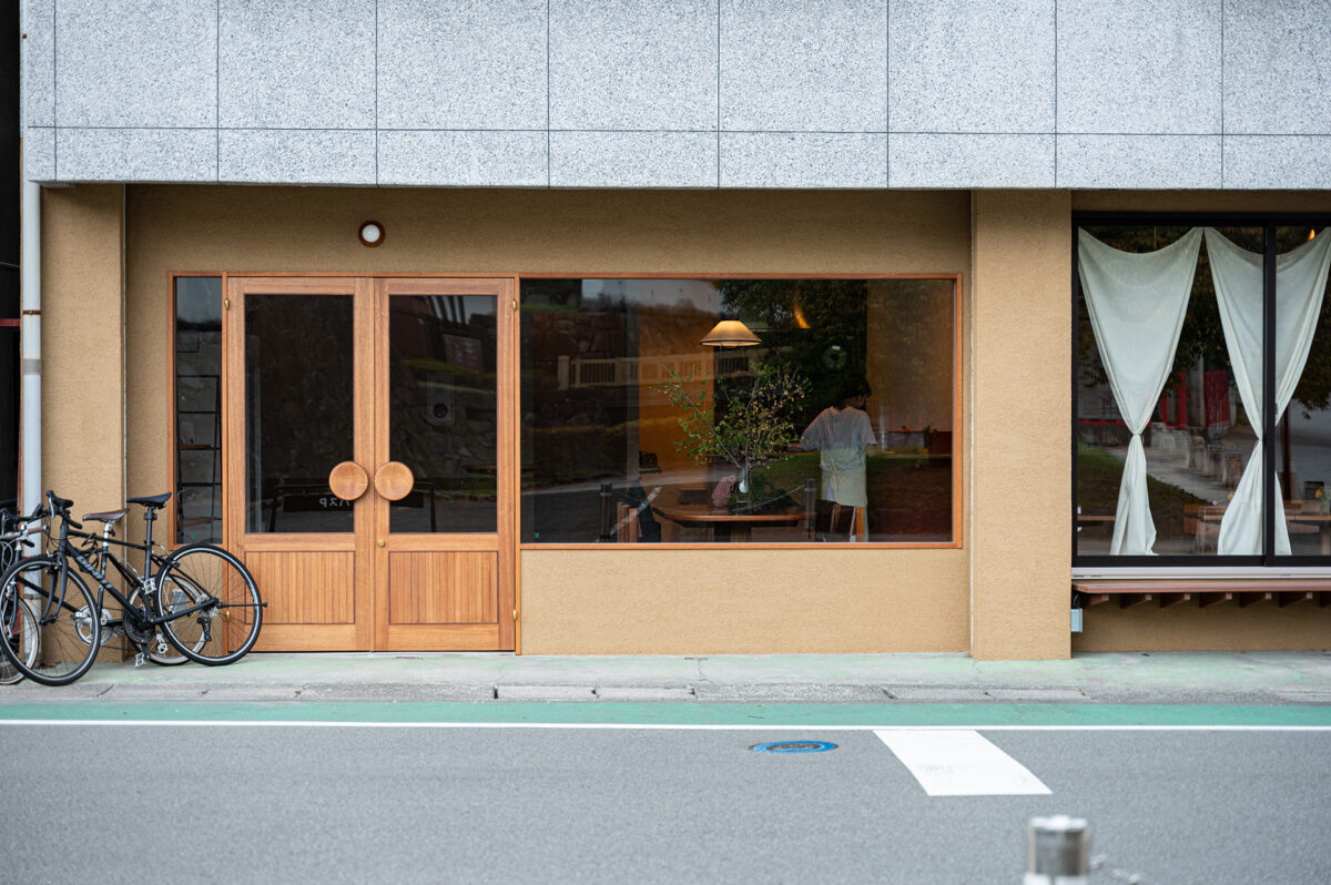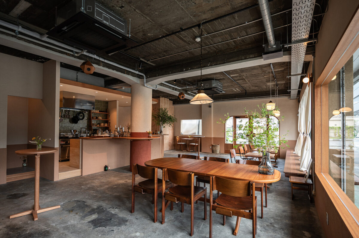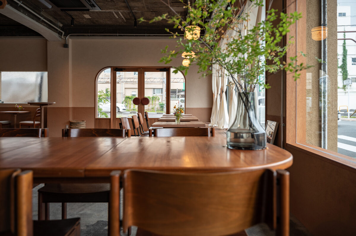 1階のカフェは、静かで洗練された時間が流れる、大人のための隠れ家のような雰囲気です。無機質なコンクリートと温かみのある木製家具が調和した空間に、自然光が優しく差し込みます。窓の外に広がる緑と石垣を眺めながら、淹れたてのハーブティーを片手にゆったりと過ごせます。