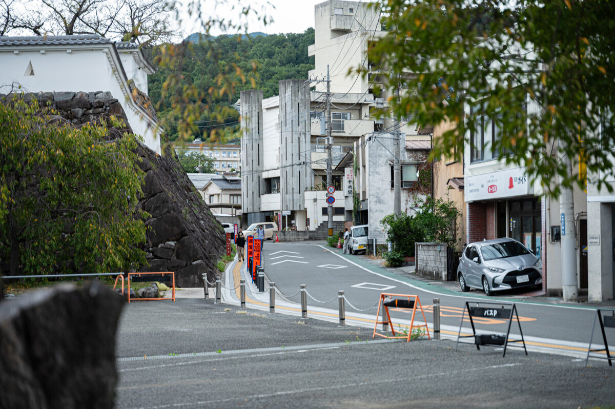 舞鶴城公園の南東から北へ向かう道は、甲府城の石垣が目の前に迫るようにそびえ立ち、その壮大さを間近で感じられる道。