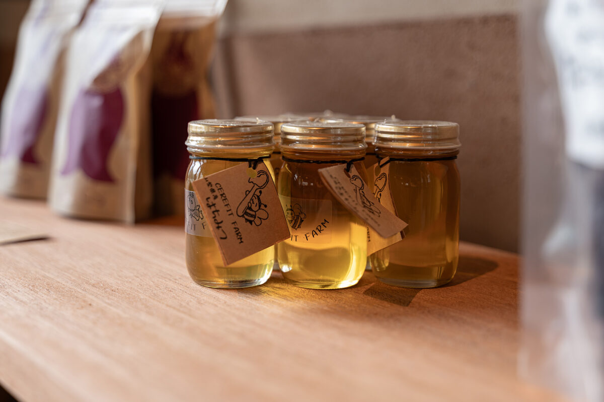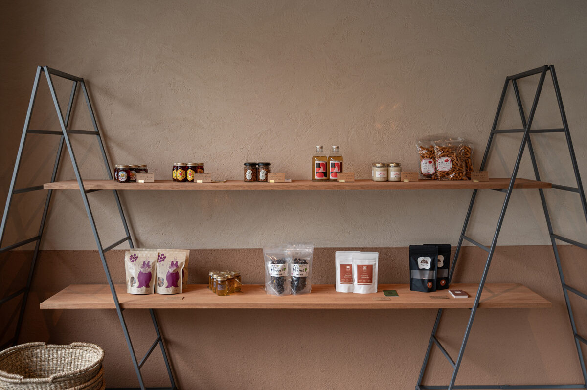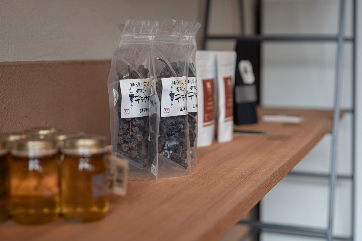 グローサリー(食料品物販)コーナーもあり、加工食品や調味料、山梨ワインなど、県内を中心とした生産者さんの食料品を取り扱っています。