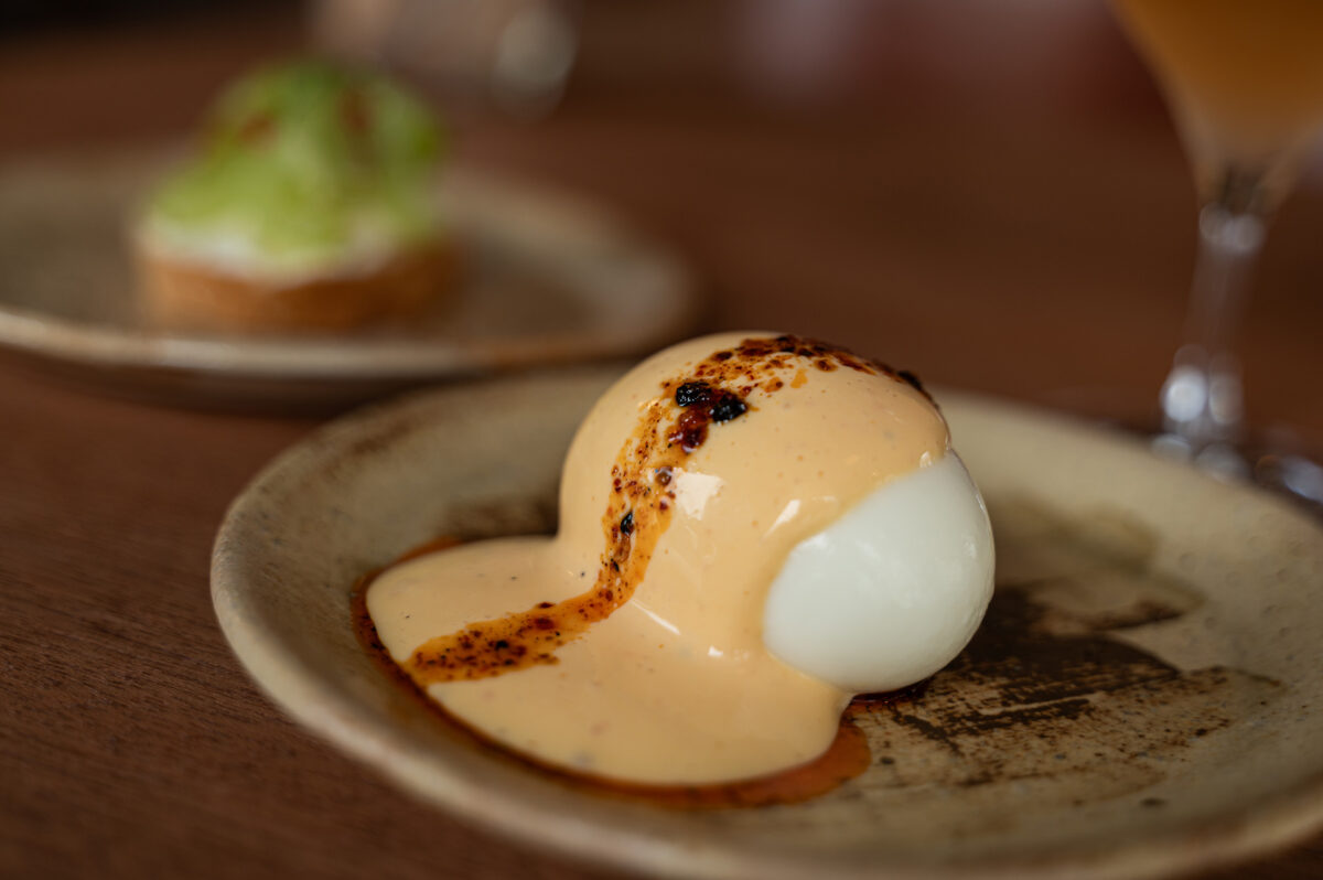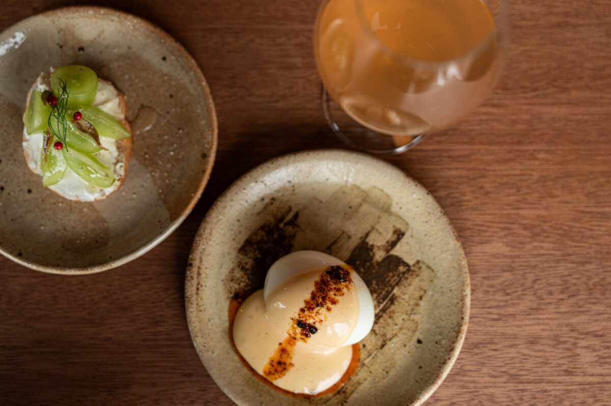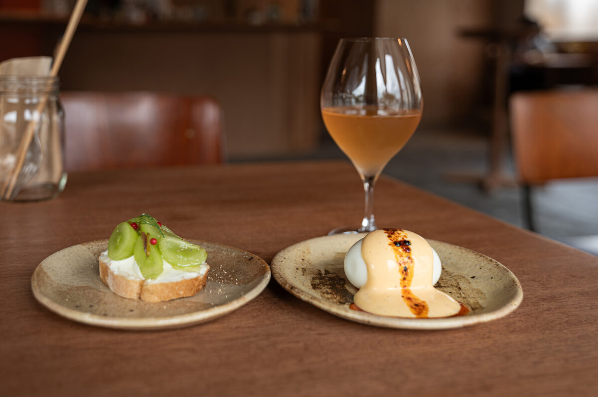 ブルスケッタは、チーズの塩味とマスカットの爽やかな甘みが広がり、それぞれの味わいを引き立て合っています。サンラーウフマヨは、ピリ辛ソース×まろやかなマヨネーズと半熟卵が絶妙な組み合わせ!どちらも、他では味わえない美味しさです。ワインは、蜜のような甘みと柑橘系の爽やかさが広がり、すっきりとした心地よい後味を楽しめます。